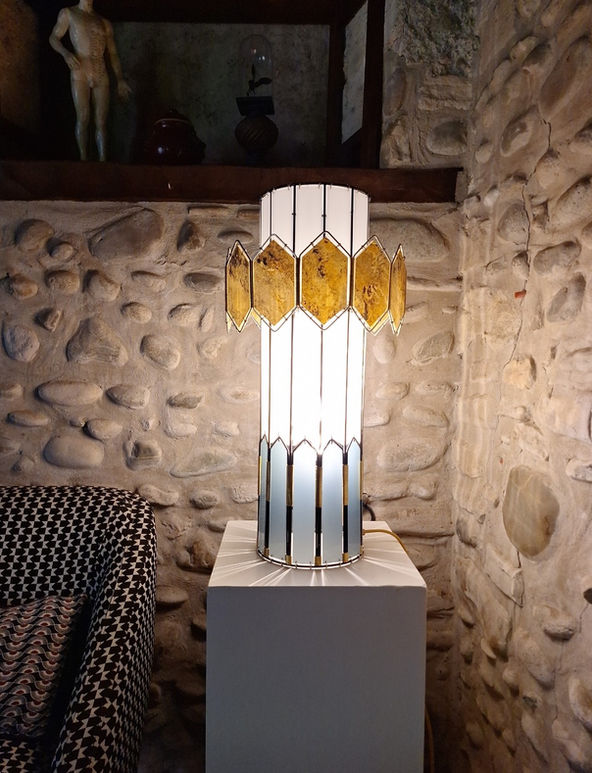 Le cylindre en acier peinture thermolaquée noire est habillé de plexiglas blanc et gris variant avec la lumière. Un fil de laiton vient habiller certaines jonctions du pied